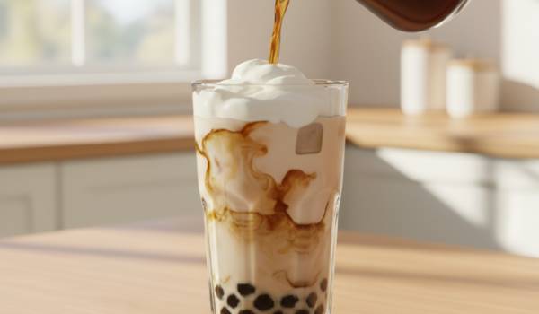 – Dùng muỗng hoặc nghiêng ly nhẹ để quét syrup đường đen lên thành ly, tạo vệt màu nâu sóng sánh đặc trưng.